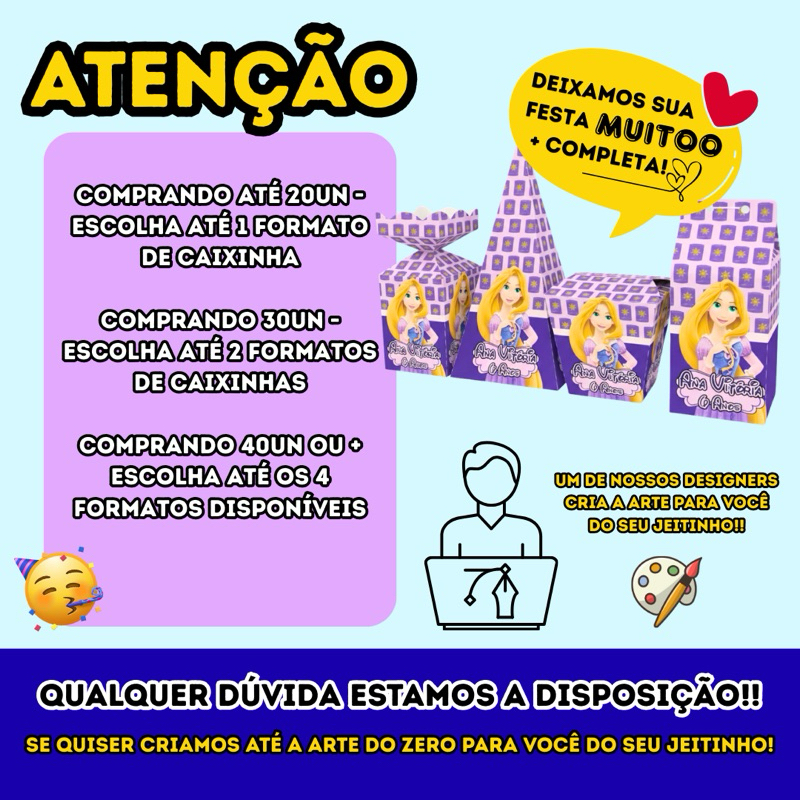 ESCOLHA a ARTE do jeito que você quer, no TEMA de sua preferência!! 💕 ATENÇÃO: (VOCÊ ESCOLHER O FORMATO/OS FORMATOS) Até 20un é possível escolher um formato disponível; 30un até dois formatos disponíveis; Á partir de 40un até os 4 formatos disponíveis!!! O produto se trata de um produto TOTALMENTE PERSONALIZADO, após a compra um designer de nossa equipe é designado para sua arte, pega todas as informações das suas preferências para a arte e dentro de 2 dias úteis envia para sua aprovação, em seguida o produto é produzido e postado em menos de 24h (em dias úteis) após a aprovação!! OU SEJA, pelo CDC (Código de Defesa do Consumidor) não tem reembolso nem devolução, exceto em caso de erro do vendedor, então ATENÇÃO as informações ANTES DA COMPRA para deixar sua festa ainda mais especial e sem imprevistos!! 💕 ATENÇÃO AS INFORMAÇÕES:** ❌ As caixinhas NÃO ACOMPANHAM fita nem cola! 🟢CRIAMOS A ARTE PARA VOCÊ OU COLOCAMOS SUA ARTE NA CAIXINHA!! ❌ AS CAIXINHAS NÃO VÃO MONTADAS, elas são personalizadas e enviadas já CORTADAS E VINCADAS ✅, a montagem é fácil e acompanha um QR CODE com o vídeo tutorial de montagem. ⚠ As caixinhas PRECISAM de cola para unir as laterais (NÃO ACOMPANHA)!! ⚠Entrega rápida: Produto é enviado de 12h a 24h em dias úteis APÓS a aprovação da arte do designer no chat- que é enviada para aprovação em até 2 dias úteis após a compra (OU SEJA, caso não sejam enviadas as informações de IDADE, NOME, TEMA, FORMATO, PREFERÊNCIAS, ETC logo após a compra no CHAT ou nas INFORMAÇÕES DO PEDIDO será enviado SEM PERSONALIZAÇÃO, EM BRANCO!!). ⚠ Medidas da caixinha: - Caixinha Milk: 14cm de altura x6 cm de largura (cada lado) - ESPAÇO ÚTIL: 9cm de altura x 6cm de largura (cada lado) - Caixinha Meia Bala: 13cm de altura x 5,5cm de largura (cada lado) - 7,5cm de altura x 5,5cm de largura (cada lado) - Cone/Pirâmide: 18,5cm de altura x 5,5cm de largura *na parte inferior (cada lado) - Caixinha Sushi: 7cm de altura x 7,5cm de largura *na parte superior (cada Lado) NOSSAS MEDIDAS SÃO PADRÕES, NÃO TRABALHAMOS COM OUTROS FORMATOS OU MEDIDAS. 🟢 Nas imagens do anúncio, há uma ilustração com as medidas de cada formato para uma melhor conferência. Verifique-as com atenção antes de finalizar a compra! Lembre-se de conferir as medidas antes de finalizar a compra para garantir o melhor aproveitamento! 🌟 Características do Produto/MATERIAL: 🟢 Papel de alta qualidade (impressão com CORES VIVAS): Disponível no papel fotográfico GRAMATURA 180g brilhante. ❌As caixinhas não são de papelão!! São de papel 180g, caixinhas simples, práticas para deixar sua festa mais linda com o melhor custo-benefício!! ✅ Ideal para: Festas de aniversário, chá de bebê, casamentos, eventos corporativos e muito mais! Caso não seja enviado o nome, idade tema, etc NO ATO DA COMPRA quando chegar o PRAZO DE POSTAGEM DA SHOPEE será produzido e postado SEM PERSONALIZAÇÃO, EM BRANCO!! O mesmo serve para o retorno de aprovação da arte, caso você envie todos os dados para a arte mas não retorne sobre a aprovação do design dentro de 12h a 24h após envio da arte para aprovação, a produção e postagem seguirá normalmente com a arte criada pelo designer até aquele momento, seguindo as solicitações iniciais feitas por você de tema, idade, nome, preferências, PORÉM não terá espaço para alterações devido a demora de retorno! DÚVIDAS ESTAMOS A DISPOSIÇÃO!! Garanta já a sua caixinha personalizada e faça seus momentos ainda mais especiais! ✨