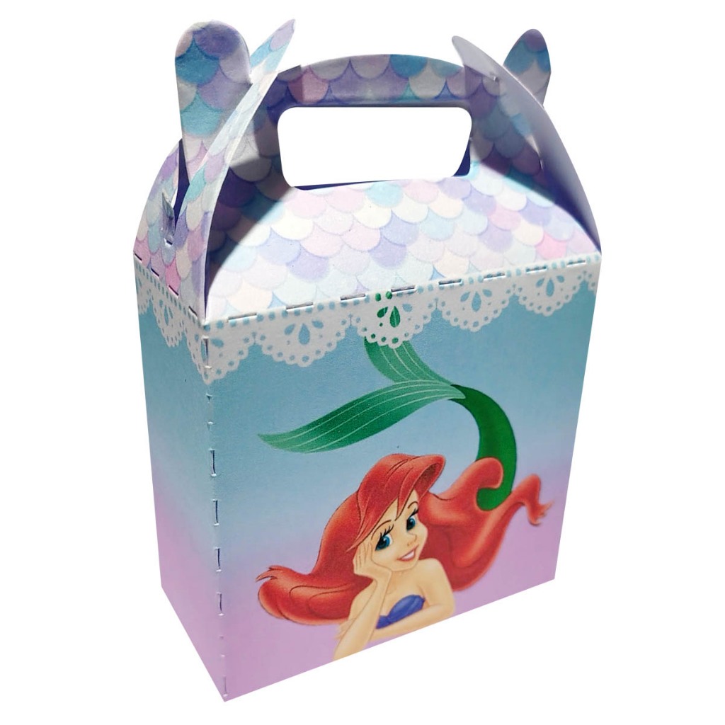 Kit Sereia Ariel - NÃO COLOCAMOS NOME E IDADE NESTE KIT Escolha a quantidade que deseja para esse kit, na variação do anúncio O Kit é composto pelos seguintes modelos na mesma proporção: Caixa Sushi Caixa Flor Caixa Maleta Caixa Redonda Caixa Piramide As quantidades dos modelos são sempre distribuídas igualmente entre os modelos de acordo com a escolha no campo de quantidade MATERIAL Papel Offset 210gr. As caixas são enviadas cortadas e vincadas. TAMANHOS DAS CAIXAS: Caixa Sushi Tamanho:7cm de largura x 6,0cm de porfundidade x 10cm de altura. Caixa Maleta Tamanho: 8,5cm de largura x 13cm de altura e 4 cm de profundidade. Caixa Piramide Tamanho:6,5x6,5cm na base x 13cm de altura. Caixa Redonda Tamanho: 9cm de largura x 4,5cm de profundidade x 10cm de altura Caixa Flor Tamanho: 6,5cm de largura x 8,00cm de altura e 6,5 cm de profundidade.