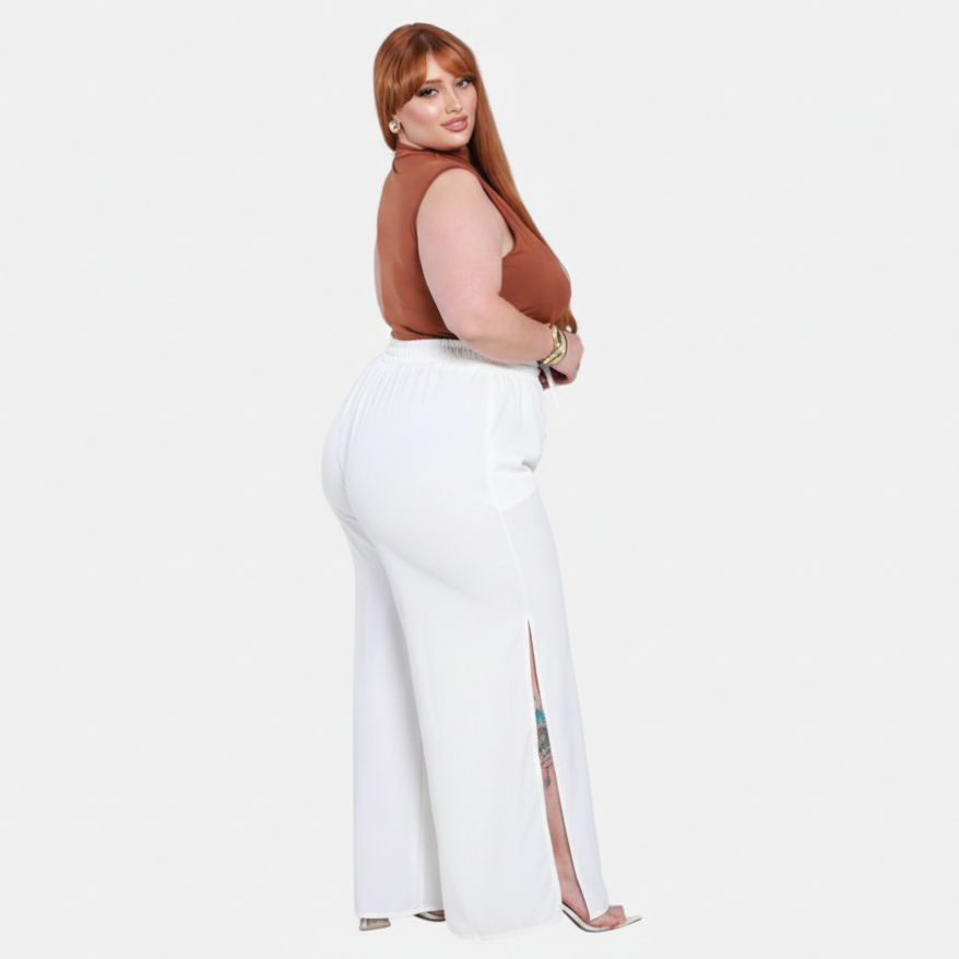 Calça Abertura Lateral Plus Size Moda Wide Legging Soltinha Crepe Liso Acinturado Social