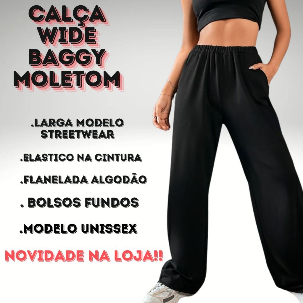 => Calça Moletom Wide com estilo Wide Leg Largo e Solto e Unissex . Possui um design minimalista e moderno, ideal para compor looks casuais ou streetwear. O que dá um ar clean e versátil à peça. Caracteristicas do produto: => Modelo: Calça Moletom Wide => Modelagem: Calça Moletom, 2 Bolsos Frontais e Cordão de ajuste na Cintura, O corte é reto e amplo, caindo solto desde o quadril até a barra, sem afunilar, proporcionando liberdade de movimento e um visual despojado, A barra da calça é reta, sem elástico, dando um toque mais sofisticado ao look esportivo Streweear e Casual => Disponível nos Tamanhos: P, M, G e GG => Tecido: 75% Algodão e 25% de Poliéster. => Estampa: DTF TABELA DE MEDIDAS: +++++ P ao GG +++++ (TAMANHO x CINTURA x ALTURA) P ) 36-38 / 72cm CINTURA / 98cm ALTURA / 118cm QUADRIL M ) 40-42 / 76,8cm CINTURA / 102,8cm ALTURA / 122,8cm QUADRIL G ) 44-46 / 81,6cm CINTURA / 107,6cm ALTURA / 127,6cm QUADRIL GG ) 48-50 / 86,4cm CINTURA / 125,8cm ALTURA / 132,4cm QUADRIL (editado) => Calça Moletom Wide com estilo Wide Leg Largo e Solto e Unissex . Possui um design minimalista e moderno, ideal para compor looks casuais ou streetwear. O que dá um ar clean e versátil à peça.