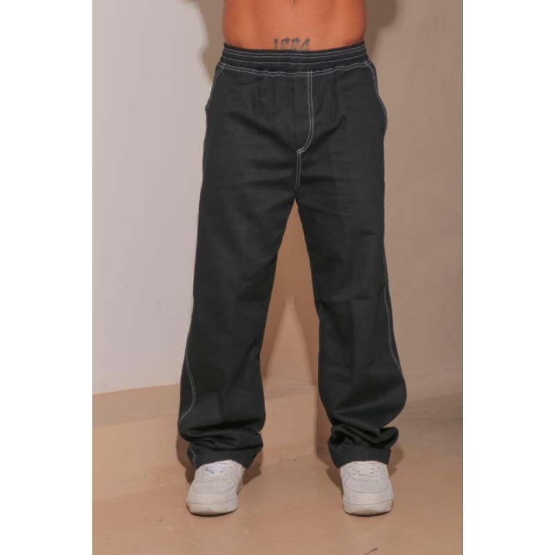 Calça Balão Larga Baggy Sarja Cintura Com Elástico Preta Linhas Brancas