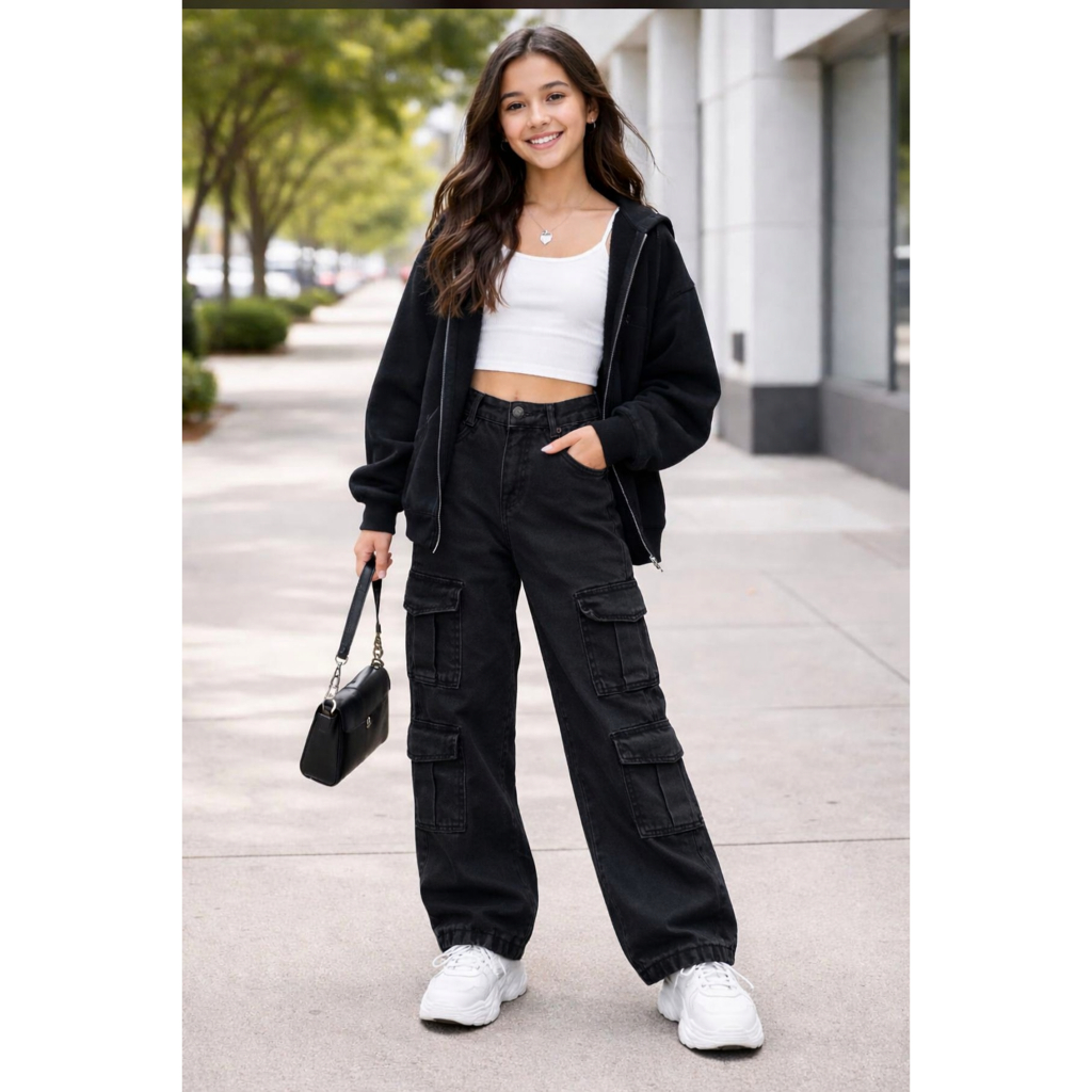 Calça cargo jeans 4 bolsos estornada juvenil super confortável e fresquinho para o dia a dia e eventos da sua princesa. Medidas de Calça Jeans Juvenil (Tamanhos 10 ao 16) Tamanho 10 – Idade 9 a 10 anos • Cintura: 60 a 62 cm • Quadril: 72 a 76 cm • Comprimento total: 86 a 89 cm • Entrepernas: 64 a 66 cm Tamanho 12 – Idade 11 a 12 anos • Cintura: 64 a 66 cm • Quadril: 78 a 82 cm • Comprimento total: 91 a 94 cm • Entrepernas: 68 a 70 cm Tamanho 14 – Idade 13 a 14 anos • Cintura: 68 a 70 cm • Quadril: 84 a 88 cm • Comprimento total: 96 a 99 cm • Entrepernas: 71 a 73 cm Tamanho 16 – Idade 15 a 16 anos • Cintura: 72 a 74 cm • Quadril: 90 a 94 cm • Comprimento total: 101 a 104 cm • Entrepernas: 74 a 76 cm Recomendamos seguir a numeração correta para a idade do seu filho. Caso a criança for um pouco maior vale a pena pegar um número maior. OBSERVAÇÃO: Na dúvida, escolha o tamanho maior, pois a forma é pequena.