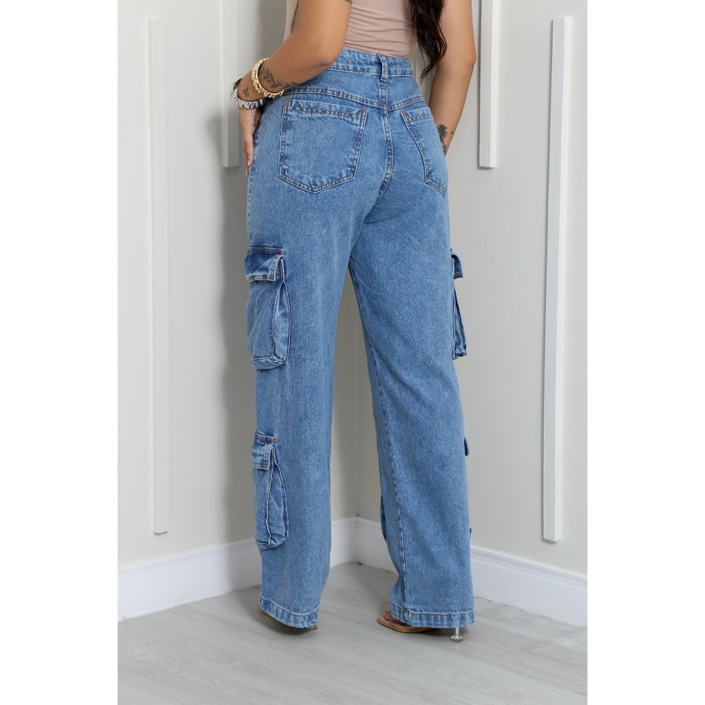 Calça Cargo Jeans Quatro Bolsos Calça Cargo com Bolso Lateral