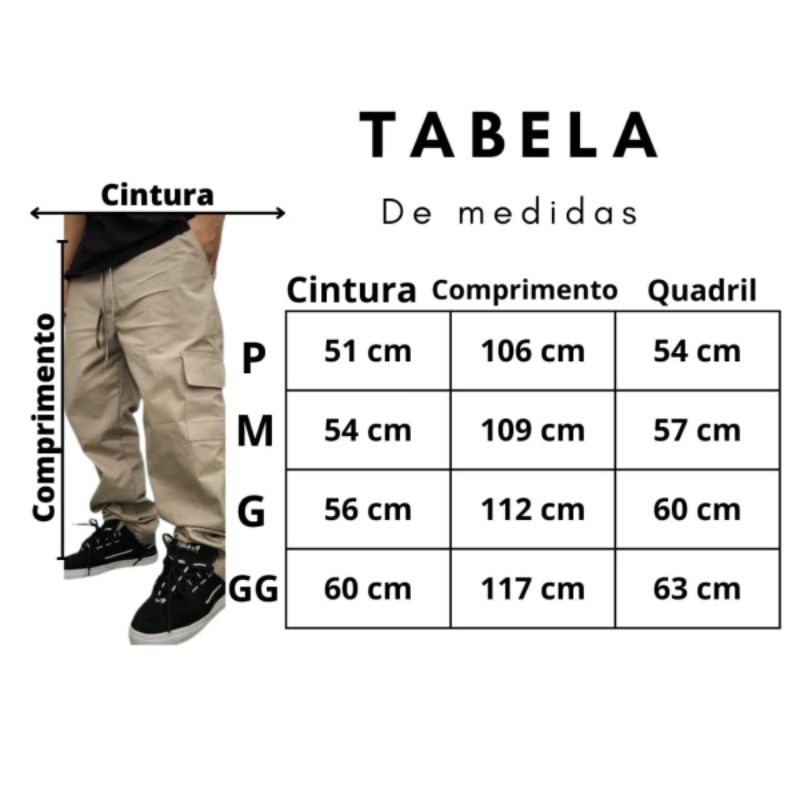 Observação: Consultar as Medidas Antes de Fazer a Compra Calça Top Estilo Cargo Skate (Peça um número menor do que você usa caso NÃO queira a calça LARGA) É ideal para a prática do esporte e também é um ótimo look para utilizar no dia a dia. Com tecido leve e soltinho trás muito conforto na hora de utilizar. Tecido: Sarja (100% algodão) Cor: Preto, Bege, e Caqui (foto pode ter variação de cor devido a iluminação) Possui 4 bolsos funcionais (dois dos lados, dois na frente ) Fechamento por Cordão Barra soltinha Tamanhos: P 36-38 M 40 G 42-44 GG 46 Dimensões: P cintura: 51cm comprimento: 106cm quadril: 54cm M cintura: 54cm comprimento: 109cm quadril: 57cm G cintura: 56cm comprimento: 112cm quadril: 60cm GG cintura: 60cm comprimento: 117cm quadril: 63cm Observação: Consultar as Medidas Antes de Fazer a Compra