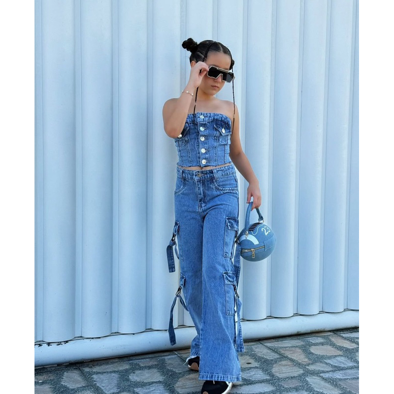 Calça Cargo Wid Leg Infantil Juvenil Crianca Calca Boca Larga Ajuste Lateral Moda Bolsa Jeans 100%