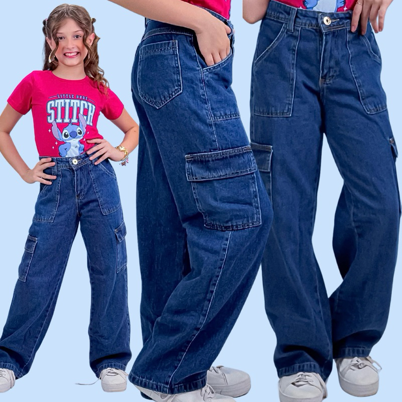 | Calça Jeans Wide Leg Cargo Infantil Juvenil Menina Bolsos | R$ 49,99 | 50% | 5.0/5 | 13 |