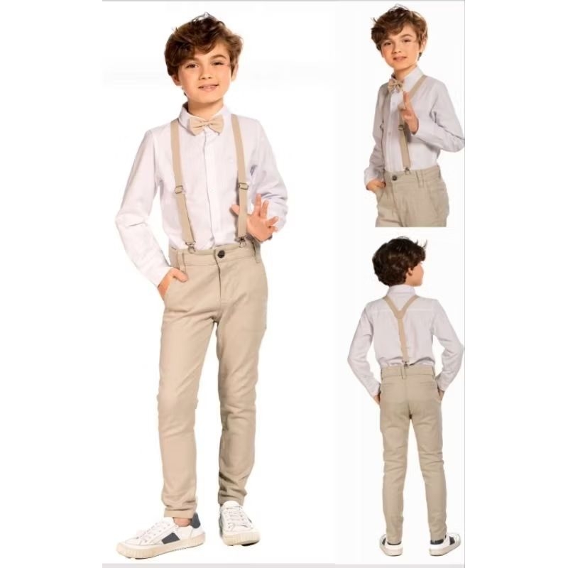 Calça De Sarja Bege Infantil, Com GRAVATA Regulador Interno E Suspensorio