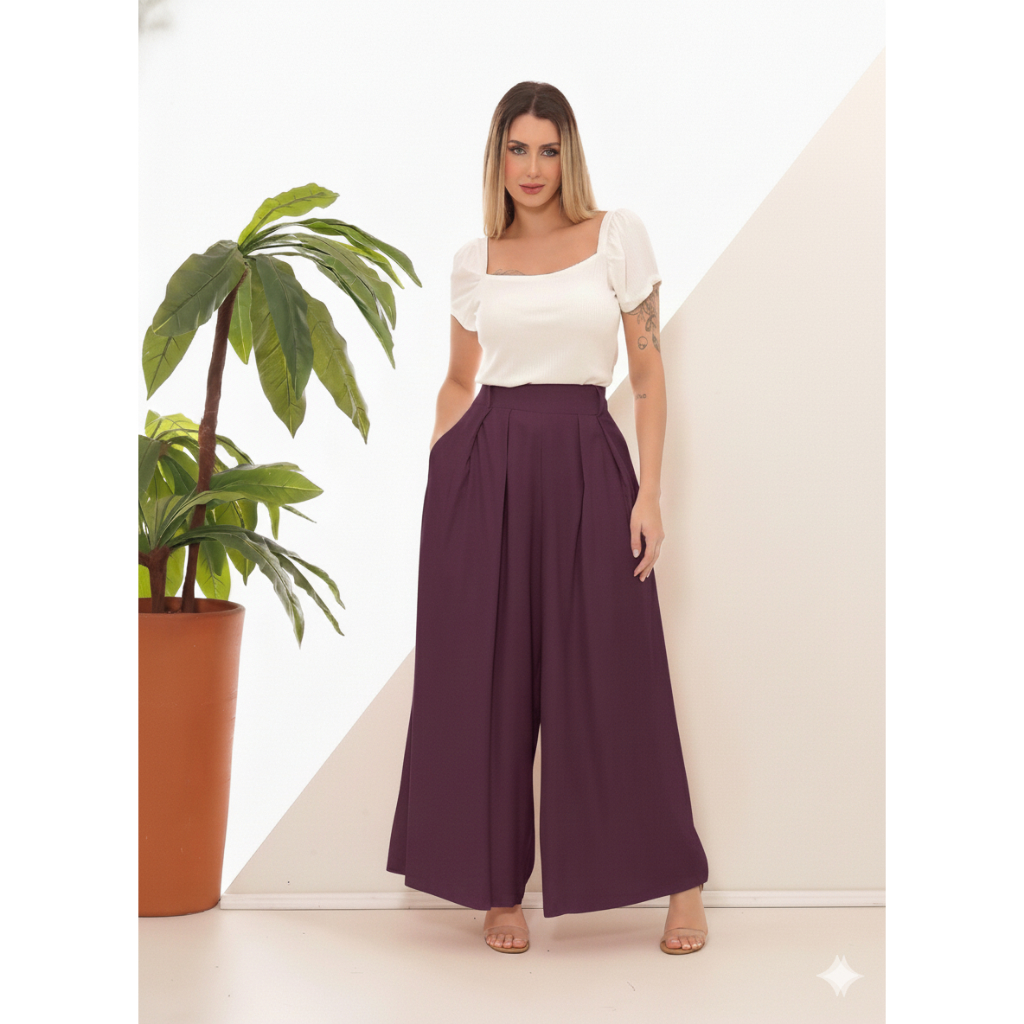 Calça Pantalona Cintura Alta com Pregas A calça pantalona perfeita para unir conforto, sofisticação e versatilidade no dia a dia. Com modelagem ampla e caimento fluido, ela valoriza a silhueta sem marcar, proporcionando liberdade de movimentos e um visual elegante. Possui cintura alta estruturada, que ajuda a definir a região abdominal, além de pregas frontais que alongam a silhueta e trazem um acabamento refinado à peça. Os bolsos laterais funcionais garantem praticidade, tornando a calça ideal tanto para produções casuais quanto para looks mais sociais. Confeccionada em tecido de toque macio e ótimo caimento, é uma peça curinga que combina perfeitamente com blusas ajustadas, camisas, croppeds ou peças mais soltinhas. Destaques da peça: Modelagem pantalona ampla Cintura alta que valoriza o corpo Pregas frontais elegantes Bolsos laterais funcionais Confortável e versátil Ideal para looks casuais, trabalho ou ocasiões especiais 📌 Observações Importantes: Medidas feitas com a peça fora do corpo. Pode haver variação de 1 a 3 cm conforme o lote de fabricação. Verifique a tabela de medidas antes de finalizar a compra. Dúvidas? Utilize o campo de perguntas, teremos prazer em ajudar.