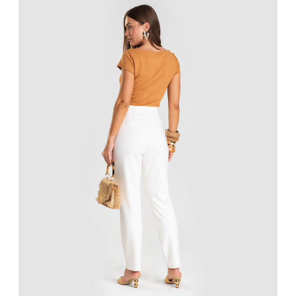 Calça Feminina Dianna, desenvolvida em malha Ponto Roma, que oferece toque macio, conforto e caimento estruturado. Conta com pence frontal marcada por pesponto, cós com revel interno frente e costas no mesmo material, braguilha funcional com zíper e fechamento por colchete interno que garante segurança e sofisticação. Sua modelagem cenoura é levemente ajustada, alongando a silhueta, com comprimento na altura dos pés. Ideal para produções elegantes, modernas e versáteis.
