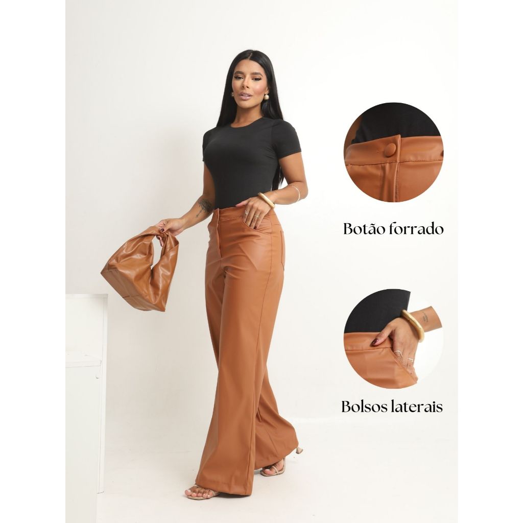 Calça Feminina Flare Couro Cintura Alta com Bolsos