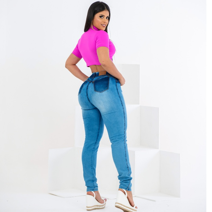 Calça Feminina Jeans Cós Alto Ate o Umbigo Com Elastano Lycra Roupas Femininas