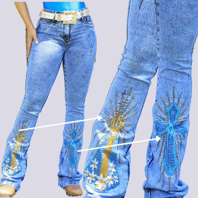 Calça Country Flare Jeans Feminina Bordada Premium – Cós Alto e Lycra A Calça Country Flare Jeans Feminina é perfeita para quem busca estilo, conforto e qualidade premium em uma peça única. Produzida em jeans resistente e macio, com composição 73% algodão, 25% poliéster e 2% elastano, ela oferece caimento impecável, flexibilidade e modelagem que valoriza o corpo. O diferencial está nos bordados exclusivos em alta definição: Terço Católico, Cruz e Nossa Senhora, detalhes que deixam a peça ainda mais sofisticada e com personalidade. O cós alto modela a cintura, alonga a silhueta e proporciona conforto para uso diário ou para compor looks autênticos no estilo country. Características • Cós alto que valoriza a cintura • Modelagem flare moderna • Bordados premium: Terço, Cruz e Nossa Senhora • Jeans confortável com elastano • Tecido de alta durabilidade • Acabamento reforçado • Produto premium com ótima qualidade Composição do tecido 73% Algodão 25% Poliéster 2% Elastano Tabela de Medidas (resumida em texto) Tamanho 36: Quadril 102 cm | Cintura 80 cm | Comprimento 114 cm Tamanho 38: Quadril 104 cm | Cintura 84 cm | Comprimento 116 cm Tamanho 40: Quadril 108 cm | Cintura 88 cm | Comprimento 116 cm Tamanho 42: Quadril 110 cm | Cintura 92 cm | Comprimento 116 cm Tamanho 44: Quadril 112 cm | Cintura 96 cm | Comprimento 119 cm Tamanho 46: Quadril 116 cm | Cintura 100 cm | Comprimento 116 cm Benefícios • Não aperta e não limita movimentos • Bordados que não desbotam • Jeans premium com caimento elegante • Envio rápido e seguro Pronta para elevar seu look country com estilo, conforto e qualidade premium.