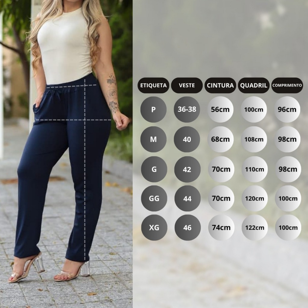 COMPRA 100% SEGURA, TODAS AS PEÇAS SÃO REVISADAS ANTES DO ENVIO. Está com dúvidas sobre o produto? Deixe sua pergunta no chat! Calça Feminina de Malha Viscolycra é a opção ideal para mulheres que procuram calças que ofereçam conforto, qualidade e estilo, possui um tecido leve e macio, ótima para qualquer ocasião. - Possui elástico na cintura, fornecendo melhor caimento no corpo. - Com bolsos frontais funcionais. - Com tiras na cintura, deixando ainda mais charmoso. - A calça possui corte reto, dando a sensação de liberdade as pernas COMPOSIÇÃO DO PRODUTO: 96% Viscose e 04% Elastano. RECOMENDAMOS CONSULTAR O GUIA DE TAMANHOS OU TABELA DE MEDIDAS PARA EVITAR DEVOLUÇÕES. Tabela de Medidas: TAMANHO P (38) : Comprimento: 99cm Cintura: 58-80cm Quadril: 86-95cm TAMANHO M (38-40) : Comprimento: 101cm Cintura: 60-86cm Quadril: 90-100cm TAMANHO G (40-42): Comprimento: 104cm Cintura: 68-96cm Quadril: 100-112cm TAMANHO GG (42-44): Comprimento: 105cm Cintura: 78-100cm Quadril: 112-120cm COMO COMPRAR DUAS OU MAIS CORES OU TAMANHO DIFERENTES? - Para comprar uma ou mais cores basta seguir esse passo a passo: - Selecione cor e tamanho, adicione ao carrinho> - Depois faça o mesmo passo a passo com outra cor e tamanho> - Entre no carrinho e efetue a compra por lá. - Qualquer dúvida estamos a disposição!