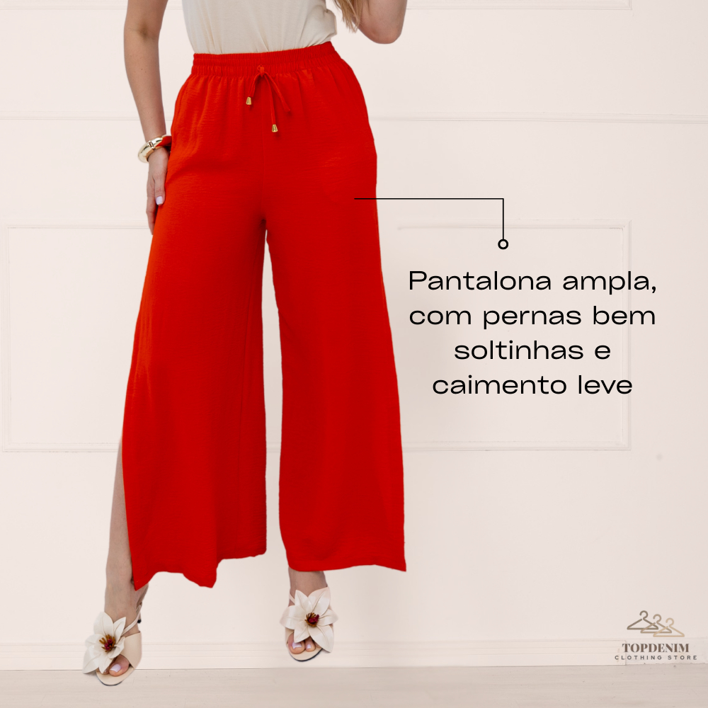 Calça Feminina Pantalona Duna Com Bolso Fenda Lateral e cós largo e Cordão