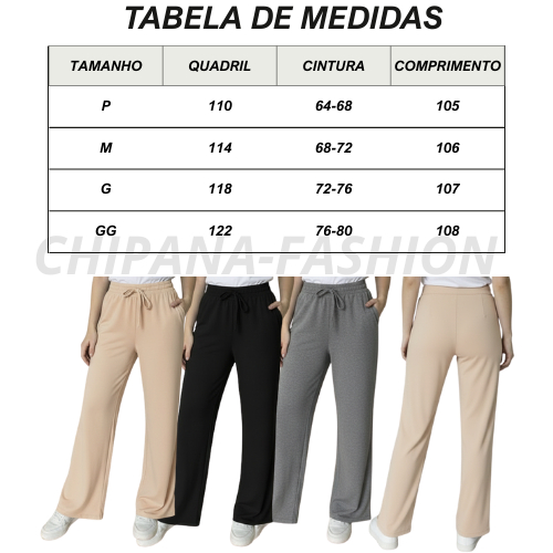 Calça Pantalona Cintura Alta - Design de cintura alta para um toque de elegância e sofisticação - Elástico para conforto e ajuste perfeito - Bolso frontal para praticidade e estilo - Tecido Duna para uma sensação confortável e leve TAMANHO E MEDIDA DE TABELA P (36): Cintura: 66cm; Quadril: 104 cm; Comprimento: 100cm M (38): Cintura: 70 cm; Quadril: 110 cm; Comprimento: 102cm G (40): Cintura: 74cm; Quadril: 114 cm; Comprimento: 104 cm GG (42): Cintura: 76 cm; Quadril: 118cm; Comprimento: 106 cm Perfeito para looks casuais ou formais! Ideal para combinar com blusas, camisas ou tops para um visual completo e elegante. Conforto e estilo garantidos!