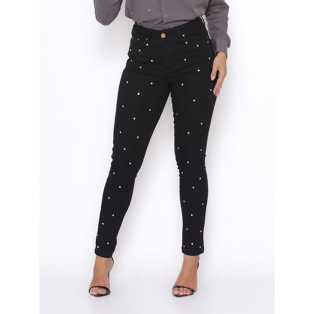 Calça Feminina Skinny Jeans Preto Pontos de Strass Levanta Bumbum Brilho