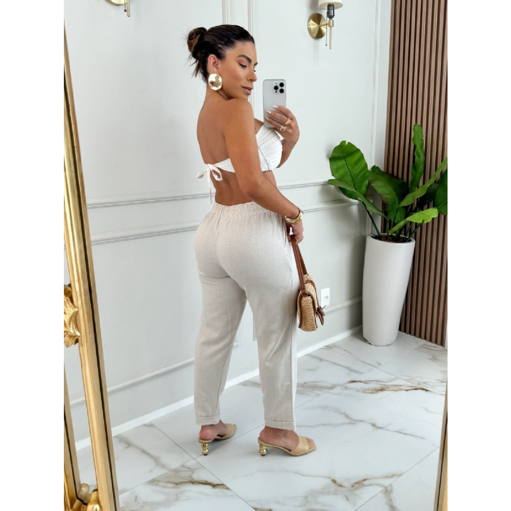 Calça Feminina TEREZA com Barra Italiana Linho PREMIUM e elástico no cós casual