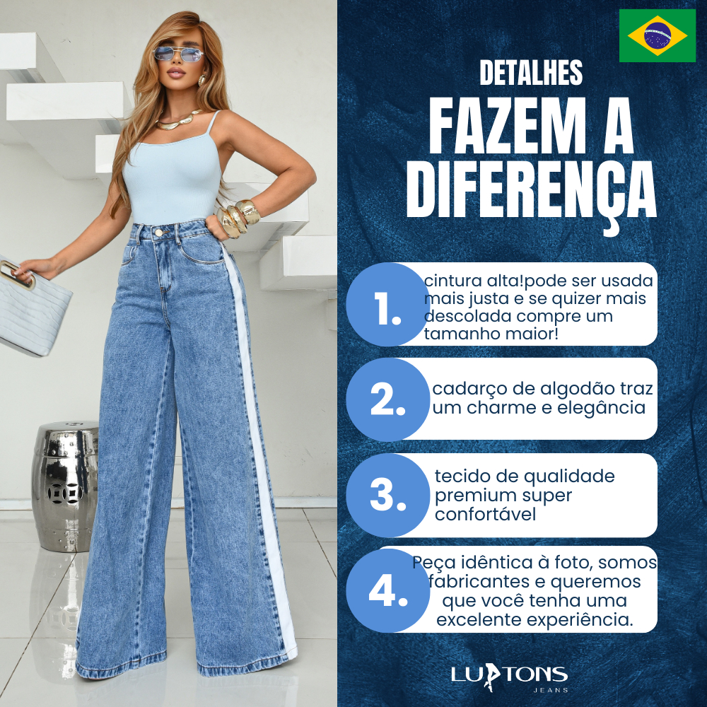 calça feminina wedi leg pantalona cintura alta perna larga com faixa branca lateral modeladora sexy
