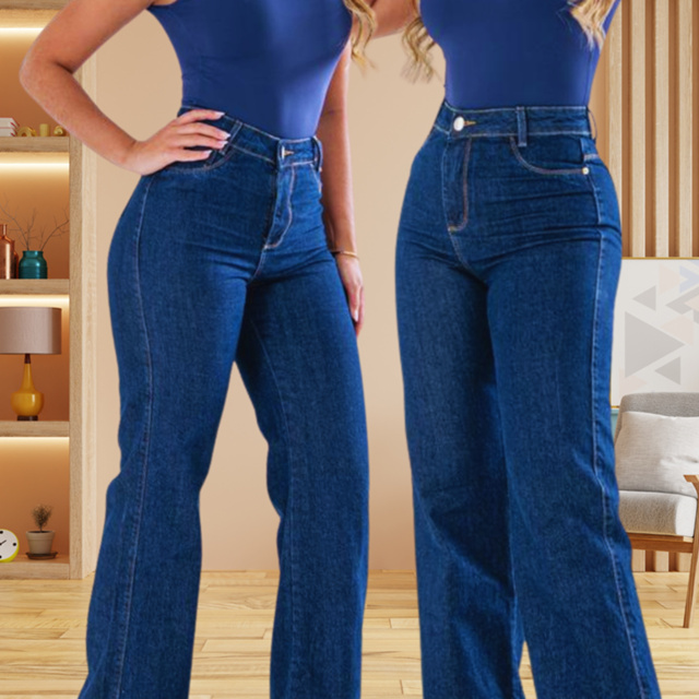 Calça Feminina Wide Leg Azul escuro sem puido 100% algodão Cintura Alta Efeito Levanta Bumbum