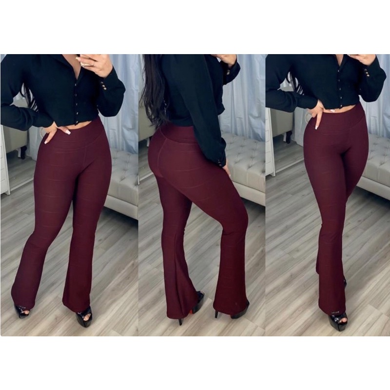 Calça Flare de Bandagem Modelo Boca de Sino Bailarina Cintura Alta e Tecido Grosso