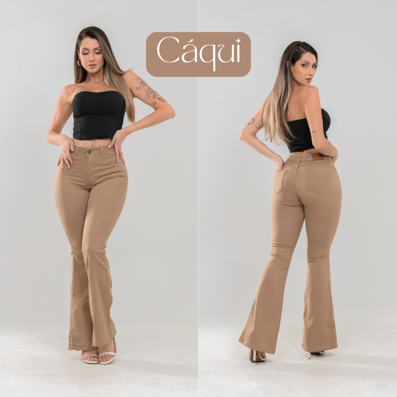 Calça Flare Feminina jeans nas cores bege/caqui super confortável , que se ajusta no corpo