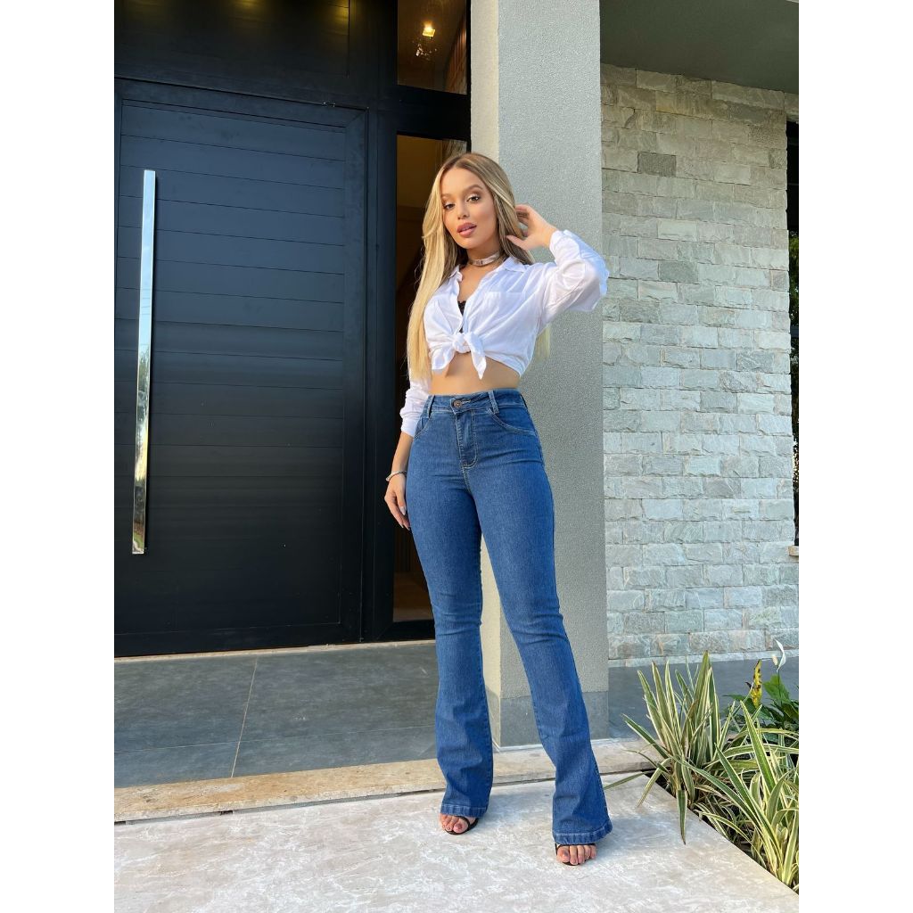 Calça Flare Jeans Feminino Cintura Alta Levanta Bumbum Modeladora Elastano Lycra