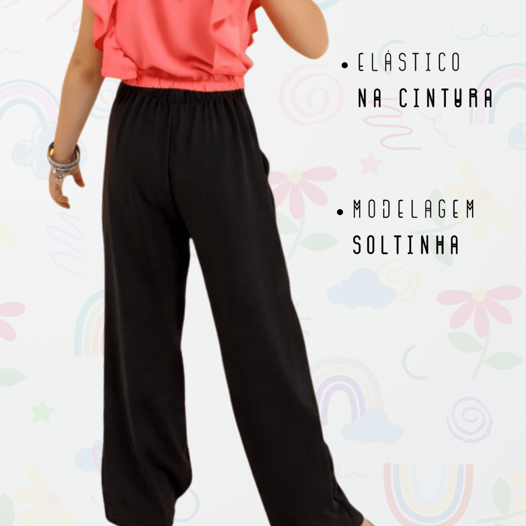 Calça Pantalona Infantil Feminina em Crepe com Bolso e Elástico na Cintura A calça pantalona infantil é perfeita para meninas estilosas que amam conforto e elegância! Feita em tecido crepe de alta qualidade, não encolhe e oferece um caimento leve e sofisticado. Possui bolsos funcionais, elástico na cintura que se ajusta ao corpo e botões decorativos, garantindo um toque moderno e delicado ao visual. Ideal para compor looks casuais ou mais arrumadinhos — combina com blusinhas, croppeds e camisas leves! Tamanho Cintura Comprimento 08 28 cm 78 cm 10 30 cm 86 cm 12 34 cm 91 cm 14 36 cm 92 cm Referência de uso: Modelo menor veste tamanho 08. Modelo maior veste tamanho 14. Detalhes do Produto Tecido: Crepe Premium (não encolhe) Modelagem: Pantalona soltinha Cintura: Com elástico para melhor ajuste Bolso: Sim, funcional Botões: Apenas decorativos Caimento leve e confortável FAQ — Perguntas Frequentes 1. O tecido estica? O crepe tem leve elasticidade, proporcionando conforto e liberdade nos movimentos. 2. Os botões são funcionais? Não, são decorativos — o fechamento é todo por elástico na cintura. 3. Posso lavar na máquina? Sim! Recomenda-se lavar em ciclo delicado e não utilizar alvejante. 4. A calça encolhe após a lavagem? Não. O tecido crepe é resistente e não encolhe. 5. É ideal para qual ocasião? Perfeita para o dia a dia, passeios, aniversários e eventos casuais — combina com qualquer estação!