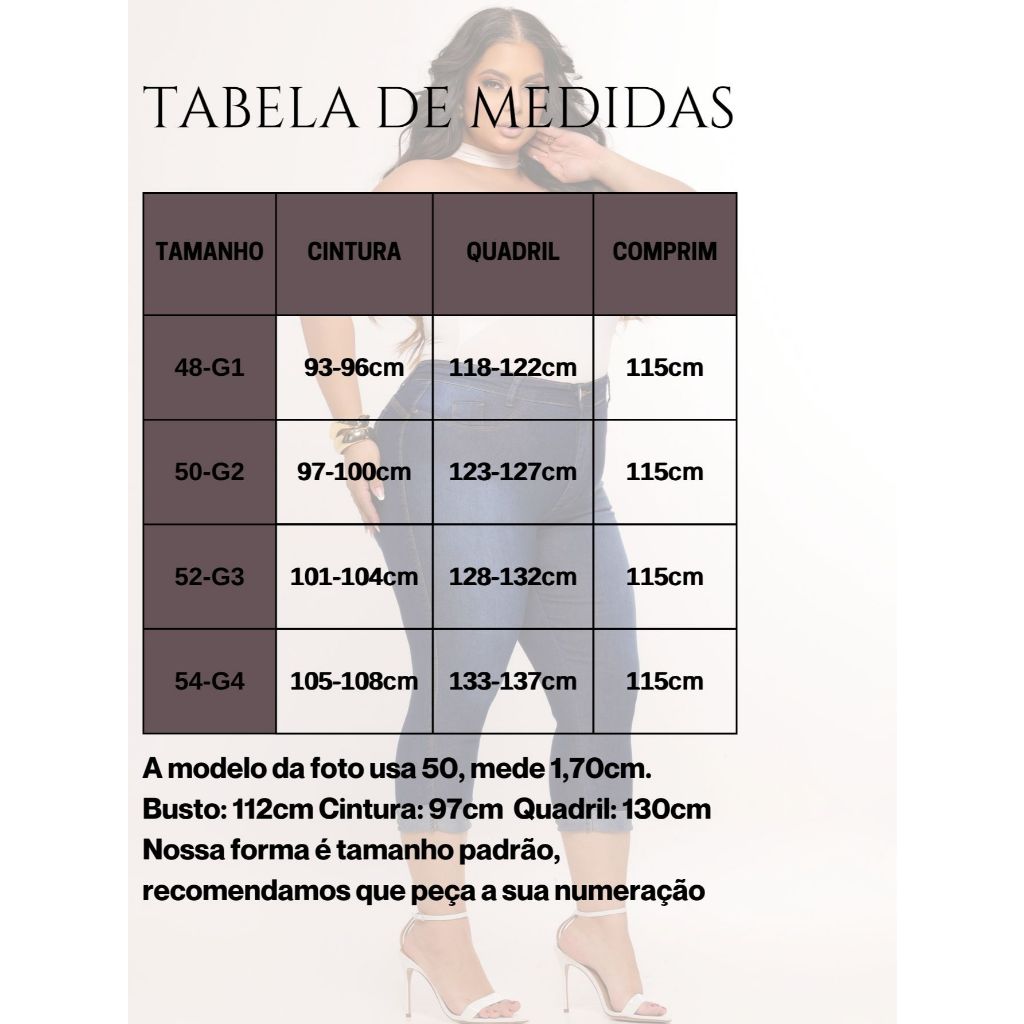 Calça Jeans Capri Feminina Plus Size Cintura Alta Empina Bumbum Modeladora Curve Moda Maior Descrição do Produto modelo: calça capri jeans plus size tecido: jeans com elasticidade para maior conforto cintura: alta, oferecendo mais suporte e modelagem ao corpo fechamento: botão metálico e zíper frontal Detalhes e Acabamento bolsos: dois bolsos frontais falsos, dois bolsos traseiros funcionais dois bolsos traseiros tradicionais costura: costura contrastante em tom caramelo, destacando o design reforço nas laterais e bolsos para maior durabilidade barra: dobrada e ajustada na altura da panturrilha Estilo e Ocasião visual: casual e moderno, ideal para diversas ocasiões combinações: pode ser usada com blusas ajustadas ou soltinhas combina bem com sandálias, tênis ou saltos baixos indicação de uso: perfeita para dias quentes, passeios, trabalho e eventos casuais Vantagens: - Marca: Duones - Composição: Jeans Premium 97% algodão e 3% elastano - Com Lycra, elastano de alta qualidade - Costuras Modeladoras: Efeito Levanta Bumbum - Botão de Alta Pressão e Zíper Reforçado - Conforto, Qualidade e Durabilidade Superiores - Dois Bolsos traseiros - Cintura alta com bastante elastano - Não desbota, mantendo a cor original - Não forma peeling, jeans resistente ao atrito TABELA DE MEDIDAS: TAMANHO CINTURA QUADRIL COMPRIM 48-G1 93-96cm 118-122cm 82cm 50-G2 97-100cm 123-127cm 83cm 52-G3 101-104cm 128-132cm 84cm 54-G4 105-108cm 133-137cm 85cm A modelo da foto usa 48, mede 1,70cm. Busto: 112cm Cintura: 97cm Quadril: 130cm Nossa forma é tamanho padrão, recomendamos que peça a sua numeração Estaremos a sua disposição! Se precisar de algo mais, é só avisar!