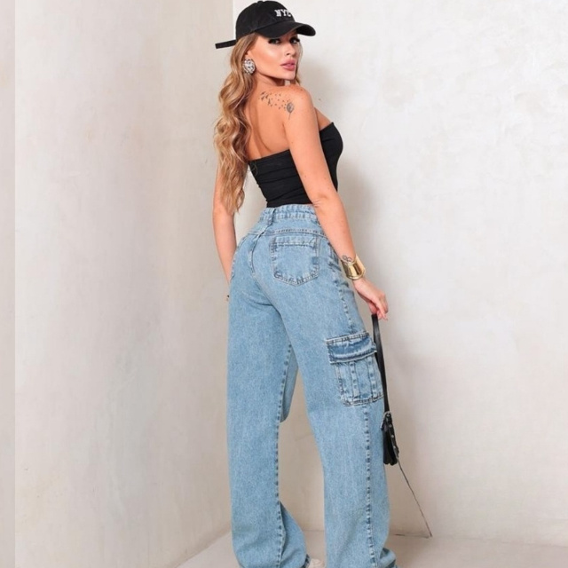 Calça Jeans Cargo Feminina Confortável Casual Versátil Tendência Elegante Moderna Festas Blogueira