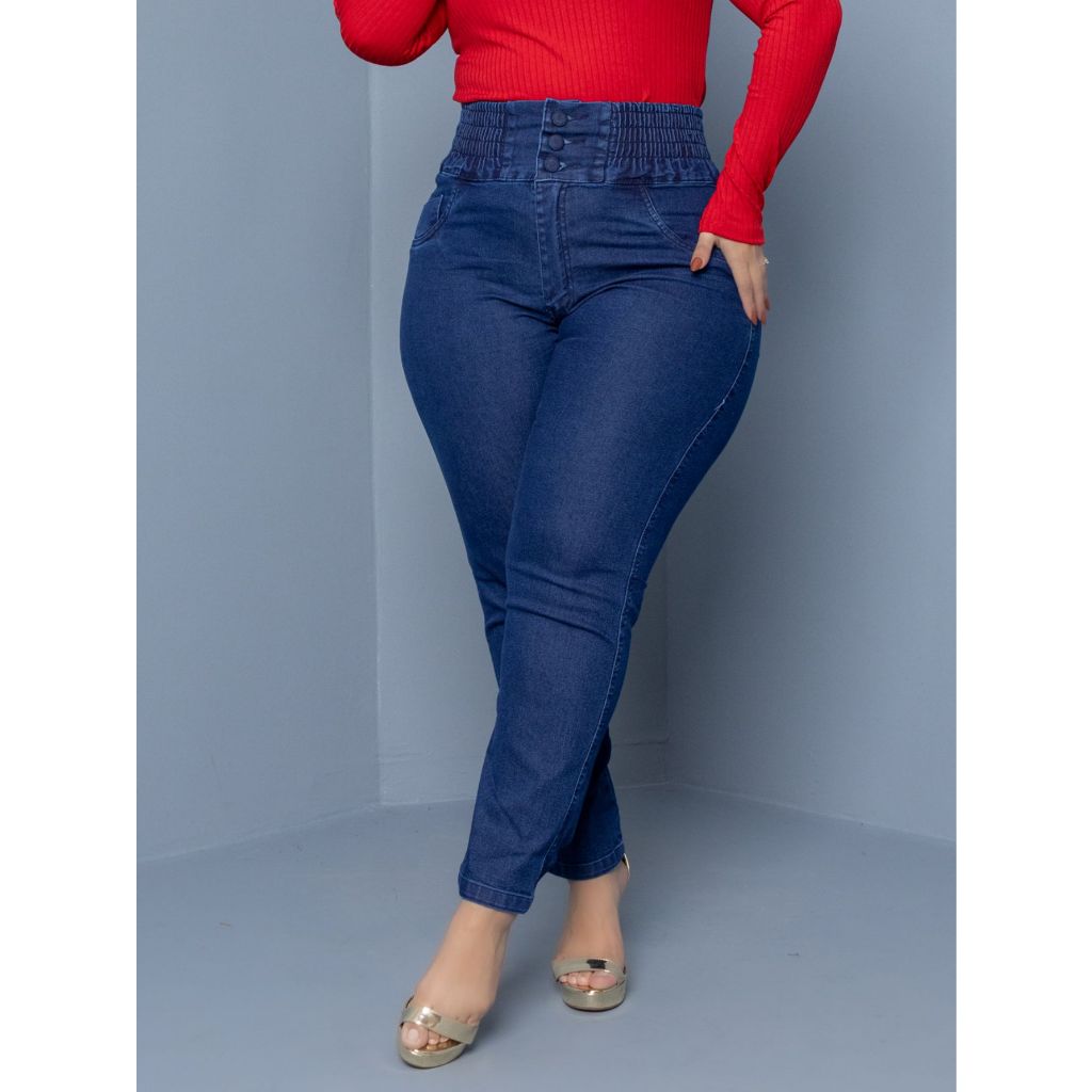 Calça jeans elástica plus size feminina cós muito alto modeladora com lycra elastano top de linha