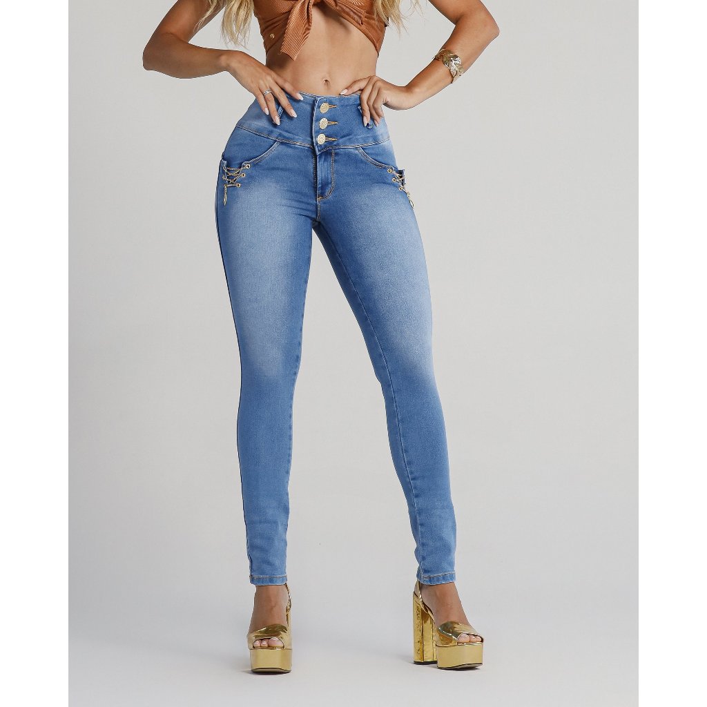 Calça Jeans Feminina Detalhes Correntinha Modelagem Levanta Bumbum Cós Alto Botões Skinny Elastano Promoção Premium Top