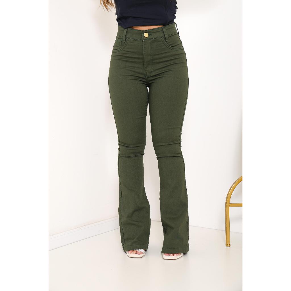 Calça Jeans Feminina Flare Verde Militar Cos Alto Levanta Bumbum elastano 3%