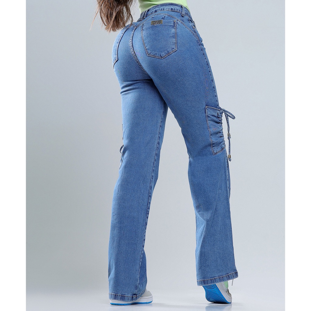 Calça Jeans Feminina Rhero Wide Leg Cargo Modeladora Empina Bumbum Com bolsos premium