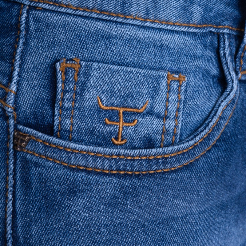 A calça jeans Basic é uma peça de roupa com acabamento classico e básico. Ela é confeccionada em denim de alta qualidade com 85% algodão e 15% elastano. Possui selo sou de algodão movimento que fomenta o uso do algodão nacional e o consumo consciente e selo BCI (Better Cotton Initiative) do melhor algodãco sustentável. Além da qualidade indiscutível a modelagem é a tradicional boot cut onde a parte superior modela o corpo e na barra tem uma modelagem mais ampla. Possui cintura média redondo na parte frontal com rebite personalizado tradicional bolso traseiro com filigrana da marca bordado em caramelo com fechamento em ziper e botão personalizado da marca. A lavagem é clara com acabamento azulado e costuras caramelo