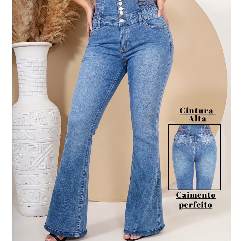 Calça Jeans Feminina Três Botões Flare Cintura Alta Modelagem Empina Bumbum