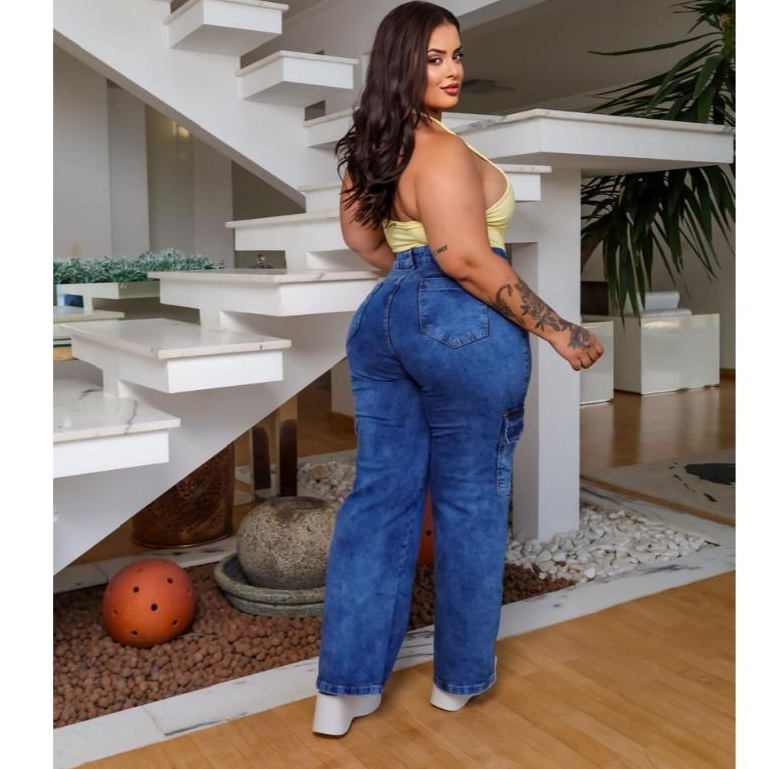 Calça Jeans Feminina Wide Cargo Premium Plus Size Casual Tendençia Elegante Estilosa Moderna Festas