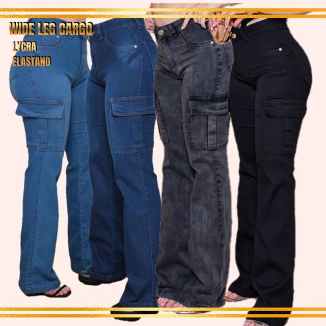 Calça Jeans Feminina Wide Leg Cargo Cintura Alta com LYCRA Elástano conforto e moda PREMIUM 36 ao 54 PLUS