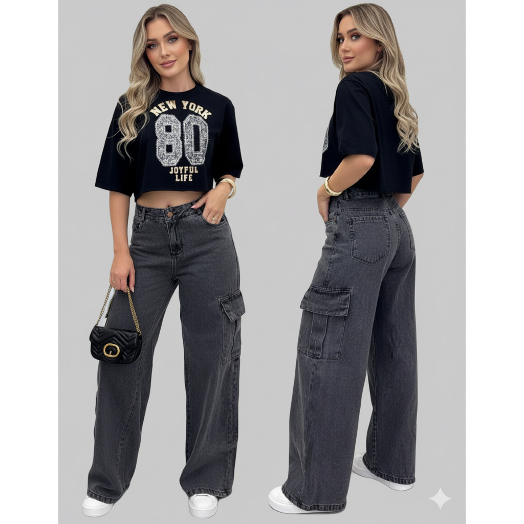 Calça Jeans Feminina Wide Leg Cargo Corte Moderno 100% Jeans Cintura Alta Conforto e Sofisticação