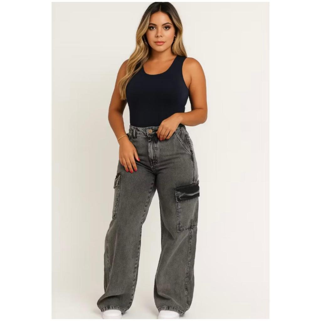 Calça Jeans Feminina Wide Leg Cargo Grafite 34 AO 54