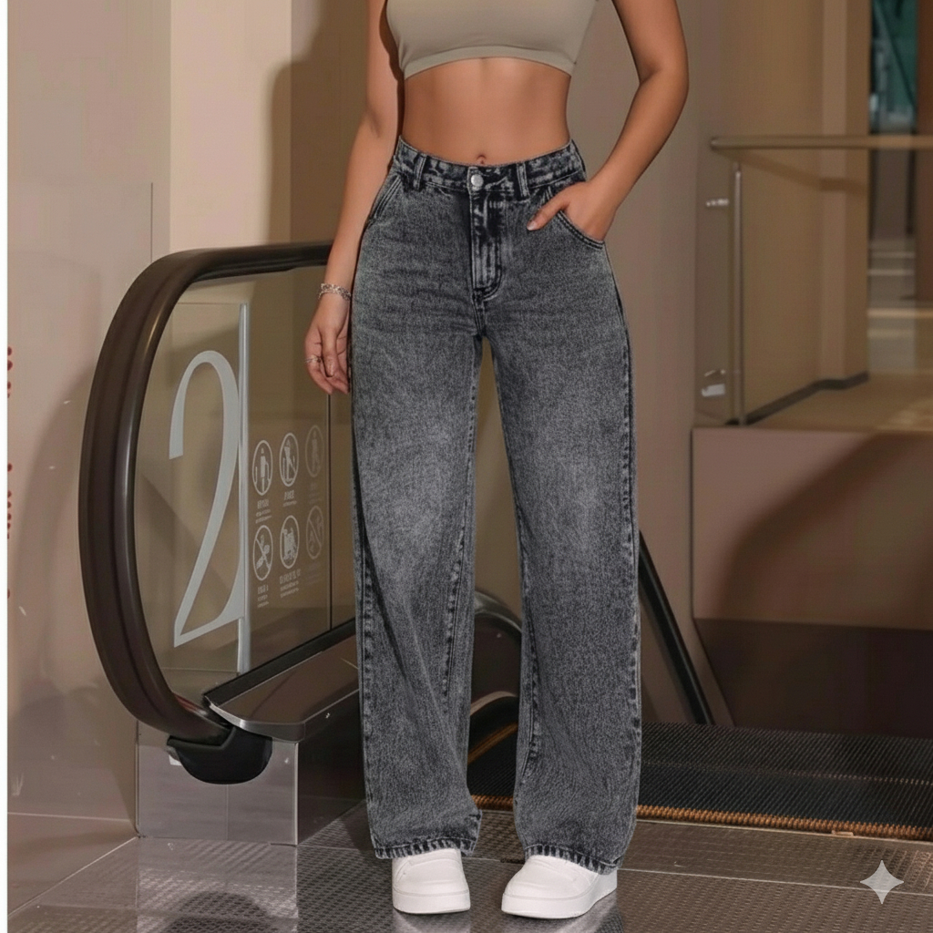 Calça Jeans feminina Wide Leg Marmorizada Pantalona boca larga cintura alta premium
