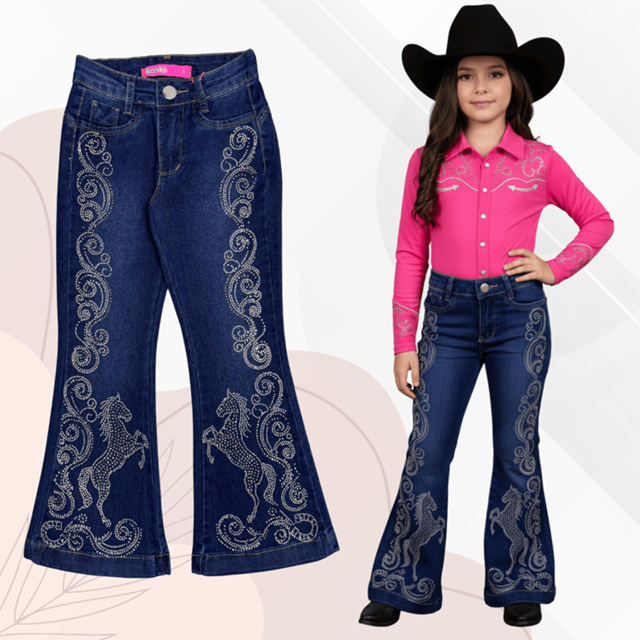 Calça Jeans Flare Feminina Infantil e Juvenil Meninas Com Strass Rodeio Ana Castela Calça de Boiadeira Country