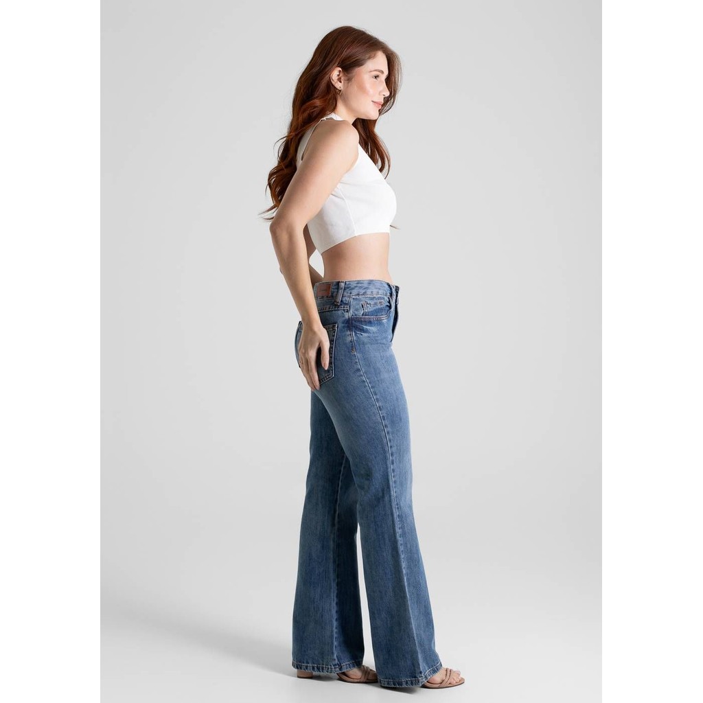 A modelagem boot cut tem o caimento ajustado nas pernas e levemente ampla barra. Cintura media Fechamento com botão e zíper Bolsos frontais e posteriores funcionais Barra simples Modelagem: boot cut Tecido: Jeans Tipo de lavagem: Azul Cor: Azul médio Composição: 100% ALGODÃO