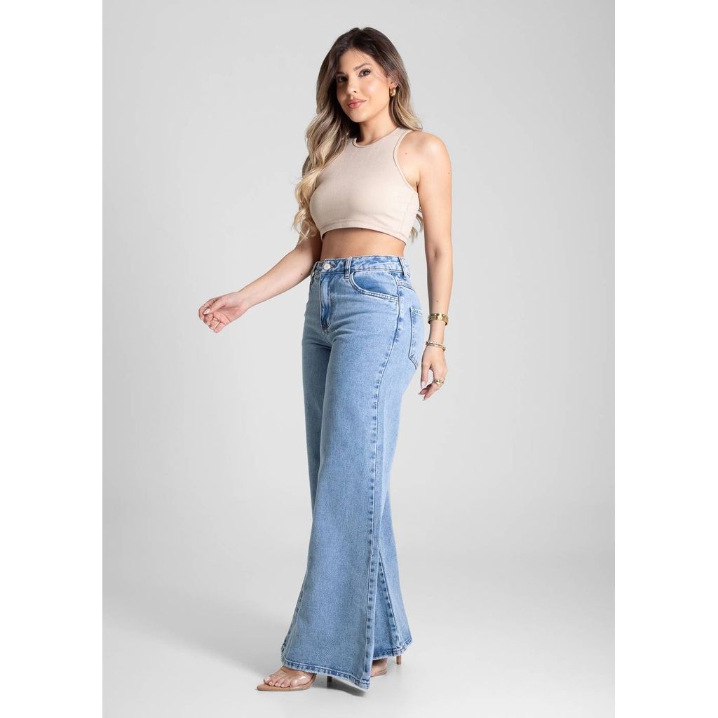 Calça feminina confeccionada em jeans. O modelo possui cintura super alta, gancho no lugar e caimento amplo da coxa até a barra, que é extra larga. Cintura alta Fechamento através de um botão e zíper Bolsos frontais e posteriores funcionais Barra simples Tecido: Jeans Tipo de Lavagem: Azul Cor: azul médio Composição: 100% ALGODÃO Tipo de lavagem: VAY VAY