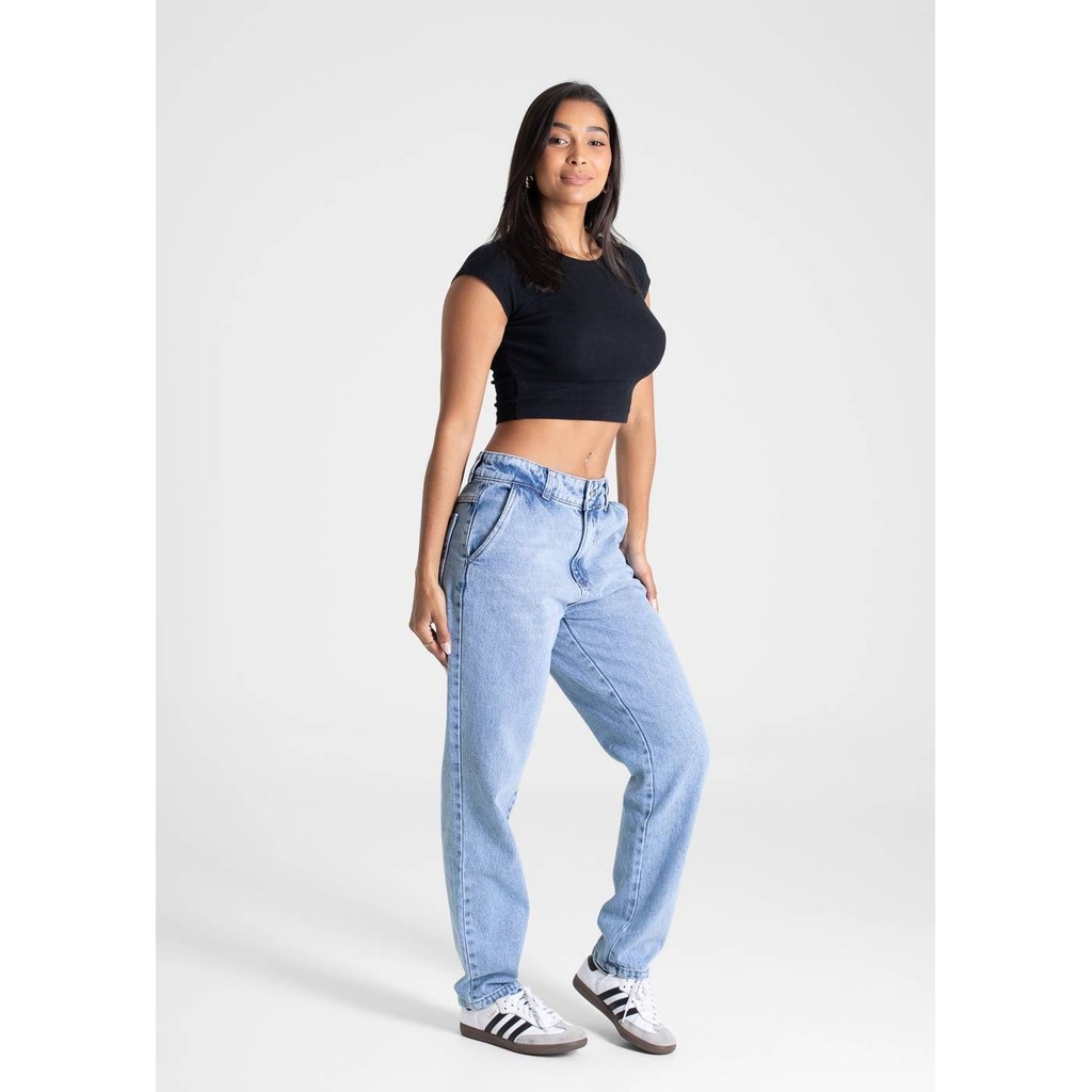 Calça mom confeccionada em jeans. A modelagem mom tem um caimento soltinho nos quadris e coxas ajustando até o tornozelo. Cintura alta Fechamento com botão e zíper Bolsos frontais e bolsos traseiros funcionais Barra simples Modelagem: Mom Tecido: Jeans Tipo de lavagem: Azul Cor: Azul claro Composição: 100% ALGODÃO