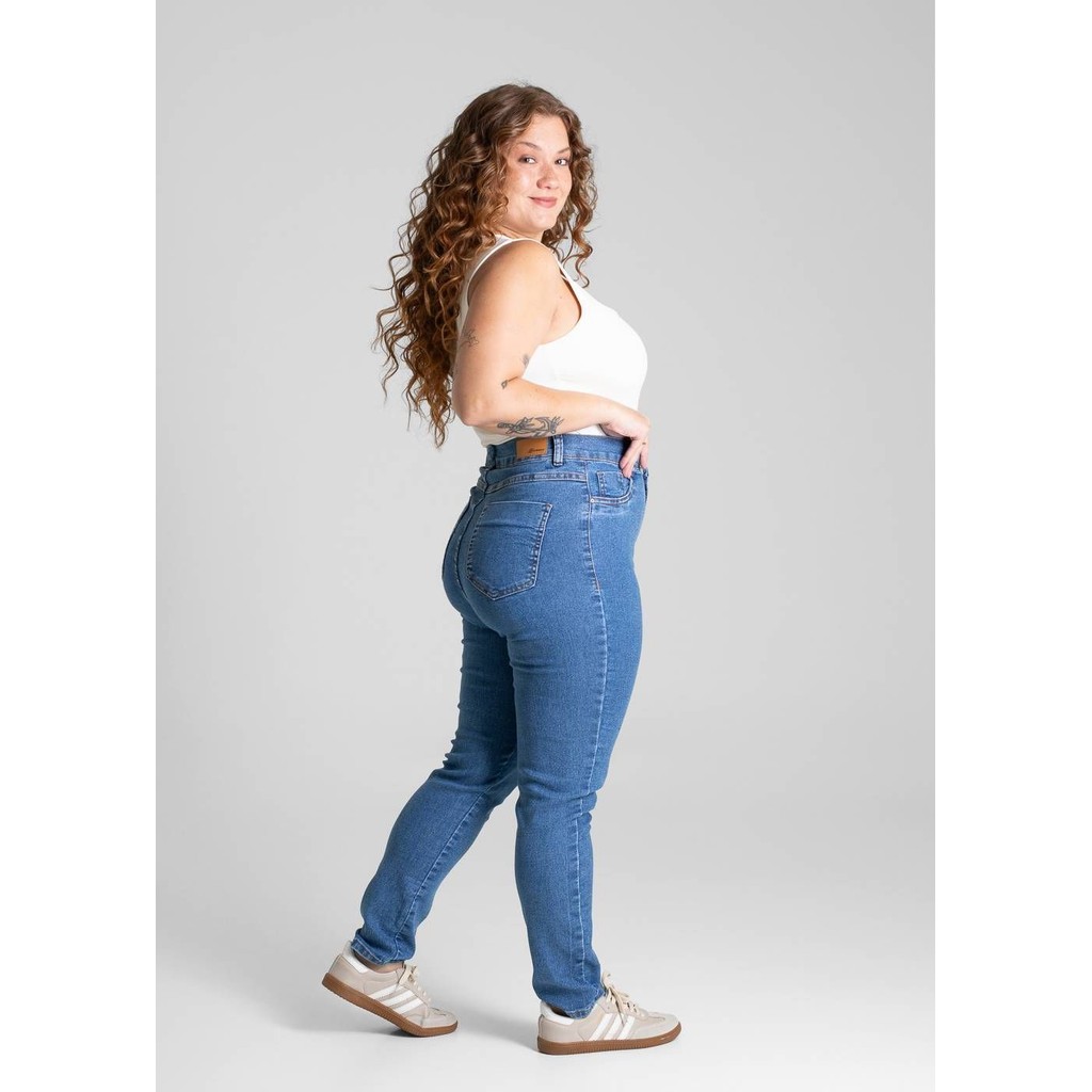 Calça plus size confeccionada em jeans. A modelagem cigarrete, sendo ajustado ao corpo até a altura do tornozelo. Cintura alta Fechamento com botão metálico e zíper Bolsos frontais falsos e bolsos traseiros funcionais Barra simples Modelagem: cigarrete Tecido: Jeans Tipo de lavagem: Azul Cor: Azul Composição: 78,5% ALGODÃO 20% POLIÉSTER 1,5% ELASTANO