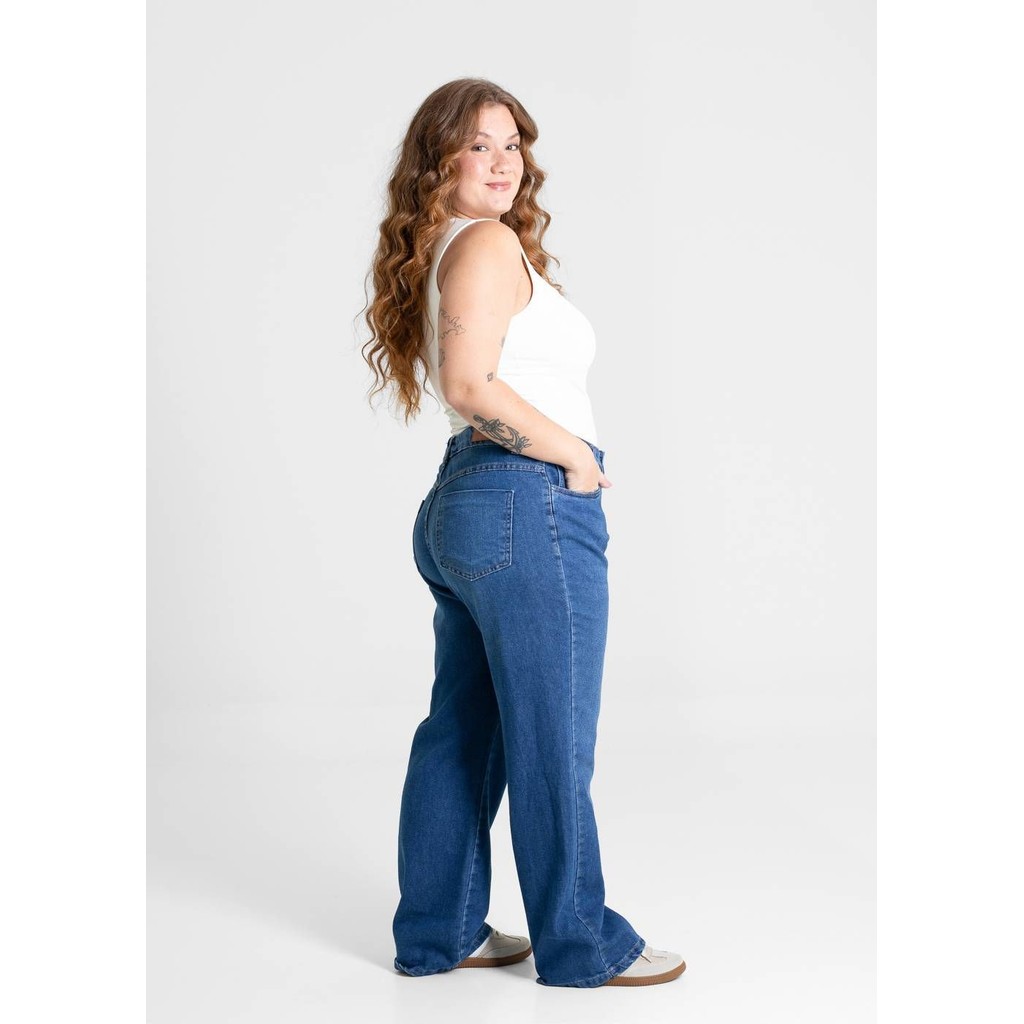Calça plus size confeccionada em jeans .modelagem reta, com caimento mais solto ao corpo. Cintura alta Fechamento com botão e zíper Bolsos frontais e bolsos traseiros funcionais Barra simples Tecido: Jeans Tipo de lavagem: Azul Cor: Azul Composição: 75% ALGODÃO 25% POLIÉSTER
