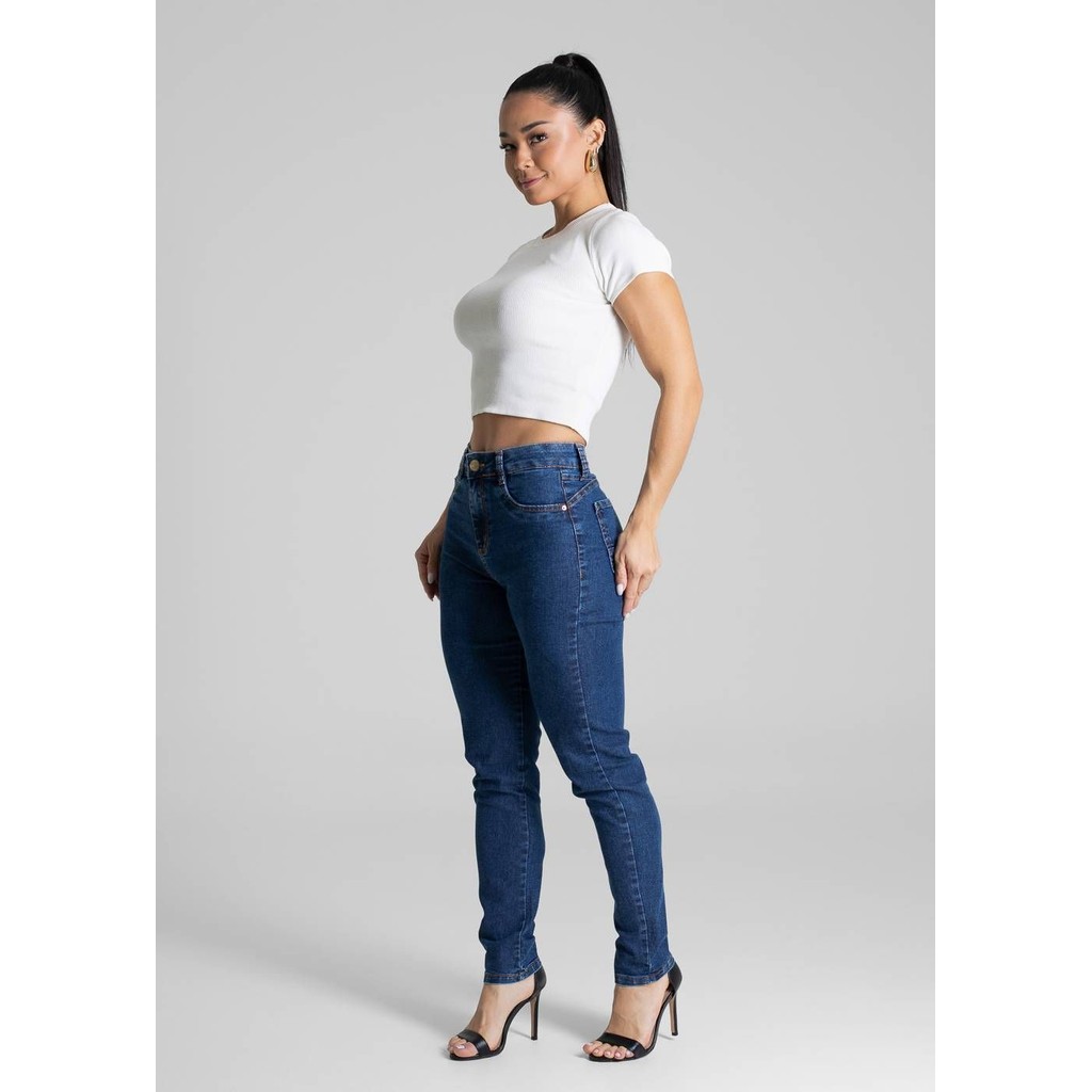 Calça push up confeccionada em jeans. A modelagem tem tecnologia para dar um UP na silhueta. Cintura média Fechamento com botão metálico e zíper Bolsos frontais falsos e bolsos traseiros funcionais Barra cortada Modelagem: Push up Tecido: Jeans Tipo de lavagem: Azul Cor: Azul Composição: 83% ALGODÃO 15% POLIÉSTER 02% ELASTANO