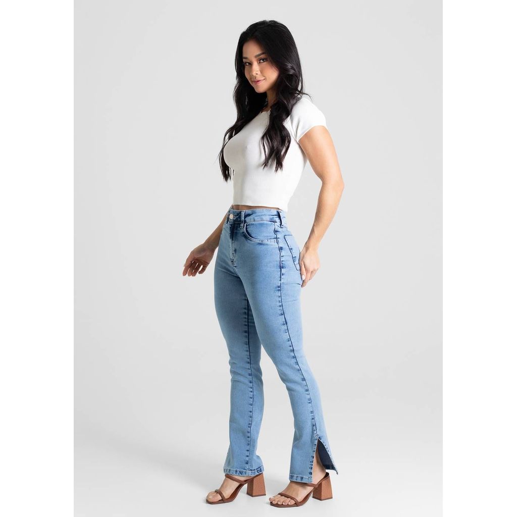 Calça jeans feminina de modelagem reta, com caimento mais solto ao corpo. Cintura alta Fechamento com botão e zíper Bolsos frontais falsos e bolsos traseiros funcionais Barra fenda lateral Tecido: Jeans Tipo de lavagem: Azul Cor: Azul claro Composição: 80% ALGODÃO 18% POLIÉSTER 02% ELASTANO