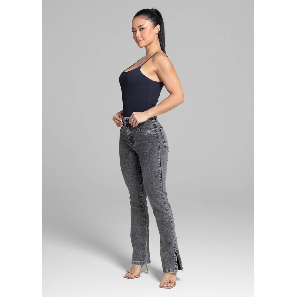 Calça jeans feminina de modelagem reta, com caimento mais solto ao corpo. Cintura média Fechamento com botão e zíper Bolsos frontais e bolsos traseiros funcionais Barra simples Tecido: Jeans Tipo de lavagem: color Cor: preto Composição: 75% ALGODÃO 23% POLIÉSTER 02% ELASTANO