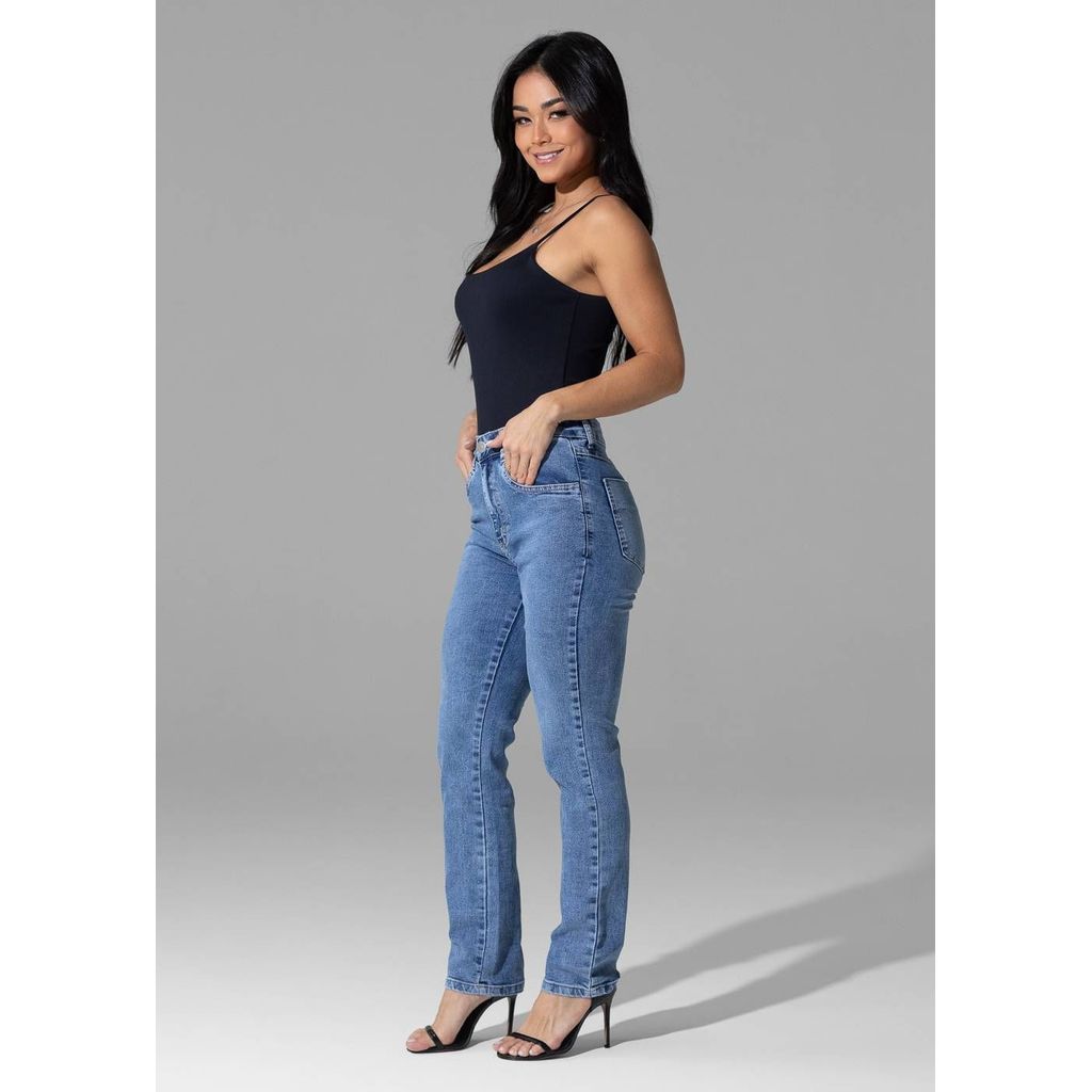 Calça jeans feminina de modelagem reta, com caimento mais solto ao corpo. Cintura alta Fechamento com botão e zíper Bolsos frontais faca e bolsos traseiros basicos funcionais Barra simples Tecido: Jeans Tipo de lavagem: Azul Cor: Azul claro Composição: 82,50% CO, 15% PES, 2,50% PUE